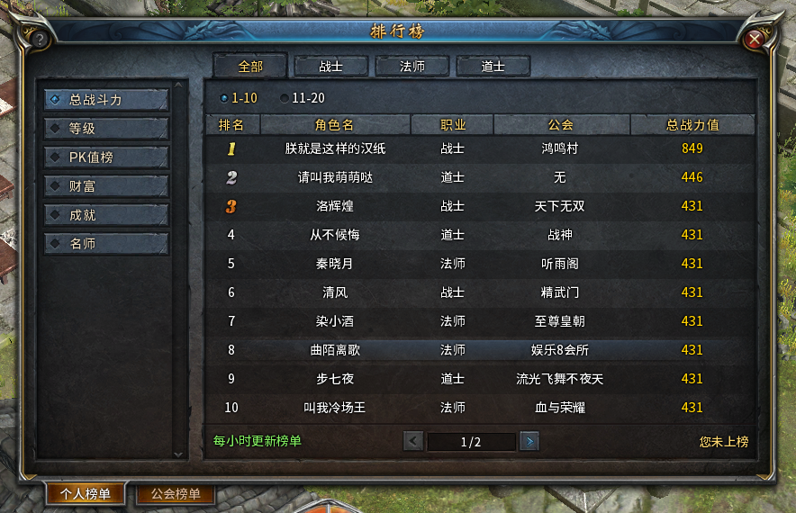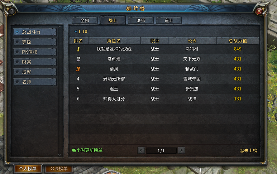 个人榜单里分为6个子榜单,分别为:“总战斗力”、“等级”、“PK值榜”、“成就”、“名师”、“财富”。