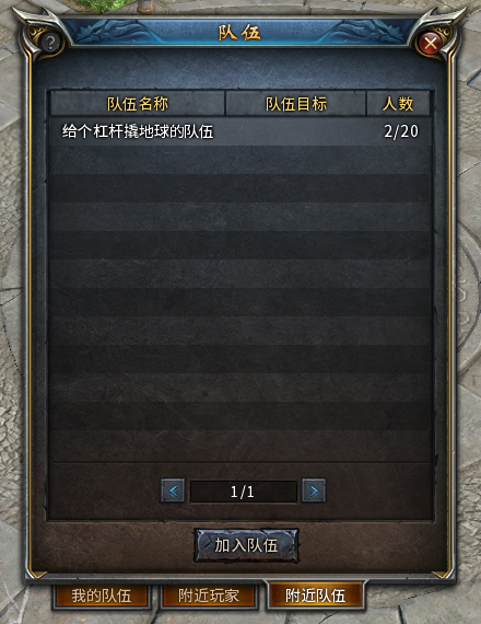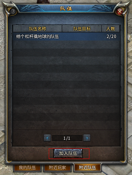 2) 打开队伍界面,在“附近队伍”面板里选择目标队伍,再点击“加入队伍”按钮,对方在收到系统提醒通过申请后,就成功加入队伍了。