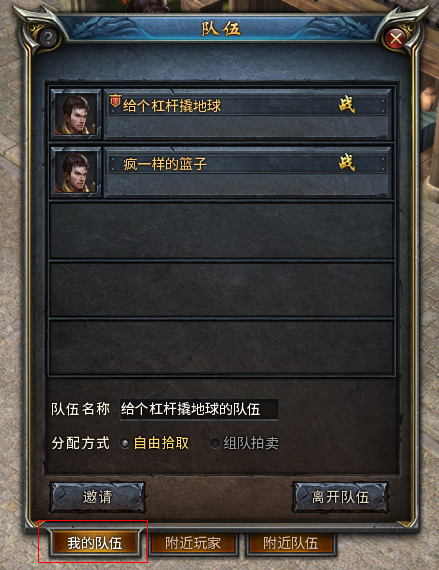 点击我的队伍界面中“我的队伍”面板下方的“邀请”按钮,在弹出的邀请列表里面选择想要邀请的成员,再点击“邀请组队”,完成邀请。但该方法只能邀请好友,公会成员或者曾经邀请过的人。