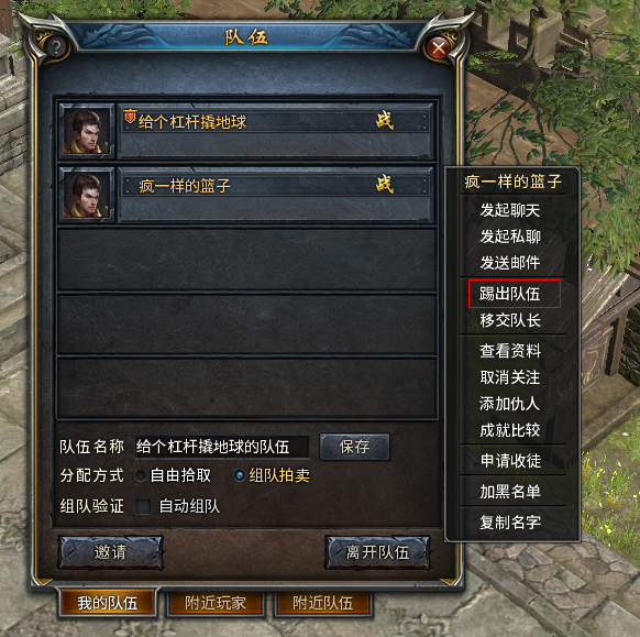 2) 在队伍面板里选择目标,右键弹出选项,选择“****”;
