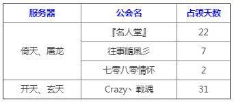 昨日,是《传奇永恒》四区(【倚天】、【屠龙】)、(【开天】、【玄天】)沙巴克攻城战的满月之日。2017年3月18日起到2017年4月17日首月沙巴克争霸战期间,共有如下公会参与了这场激烈的争夺!各服公会名及占领天数如下: