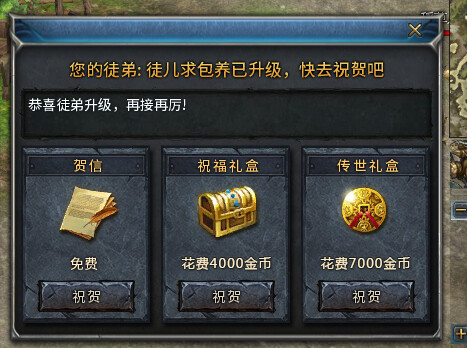 减少祝贺频率,仅在徒弟升至10级、15级、20级、25级时师父可以进行祝贺,取消同门间祝贺。提高祝贺质量,使奖励更加实用有效。祝贺礼物甚至会包括**、偃月、降魔等小极品武器哦!