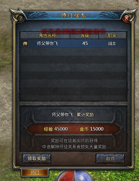 取消“强制出师”功能,徒弟出师不再需要师父同意,到等级(30级)后可以自己选择出师。