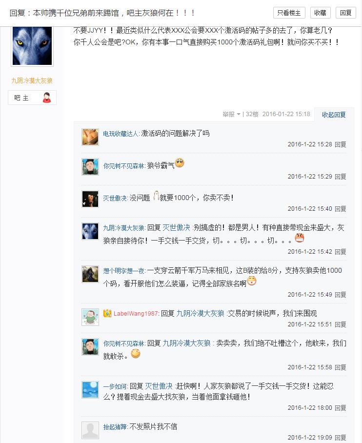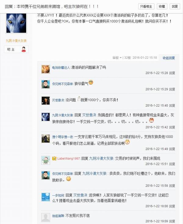 作为一名上班族,本以为周末能大施拳脚,结果F5按烂了也没刷新出京东购买页面,还以为是京东系统DOWN了。不甘心的小编溜到传奇永恒官方吧一看,贴吧炸了!据爆料,卖码首日吧主与某会长抬杠,加之众吧友煽风点火,土豪颜面受辱怒火中烧,不买他1000个码誓不罢休……