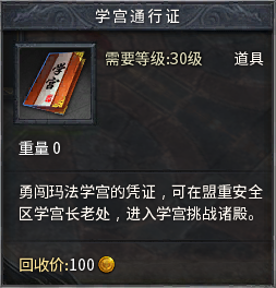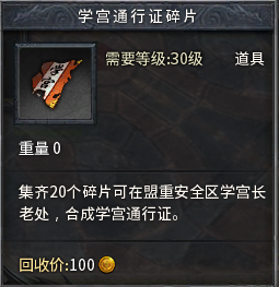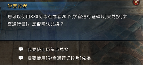 1、玩家在NPC“学宫长老”处,使用330历练点兑换“学宫通行证”1张;也可使用20个“学宫通行证碎片”兑换1张成品(“学宫通行证碎片”获取方式请见流程6)。