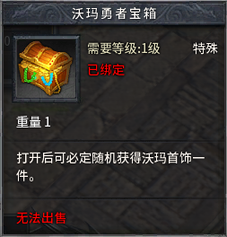 使用高级勇者卷轴开启宝箱,必得100000经验,有几率获得绑定沃玛勇者宝箱*1(打开必得随机沃玛首饰*1)、太阳水等。