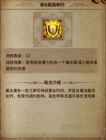 魔法盾霜骨印:延长魔法盾的时间,相对法师来说应该是一个神技。魔法盾在就能够大大增加生存的能力。猜不到什么武器能够提升魔法盾的时间。