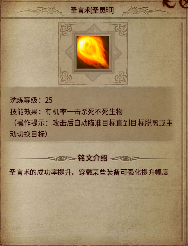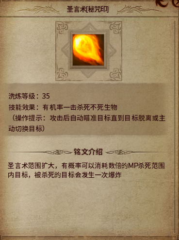 圣言术密咒术:有几率一定几率杀死范围内的圣言目标,不过圣言术本来就耗蓝,不知道用出来的几率多少,也可能会是祖玛刷怪的神技。