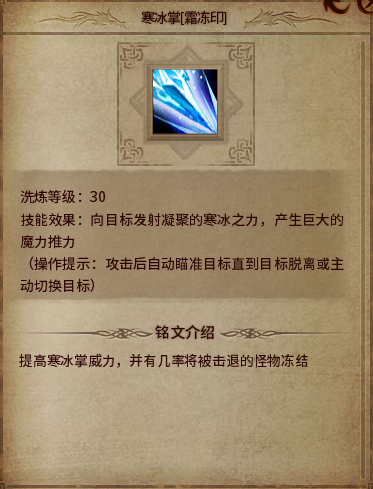 寒冰掌霜冻印:提高寒冰掌威力。有几率击退怪物并冻结。