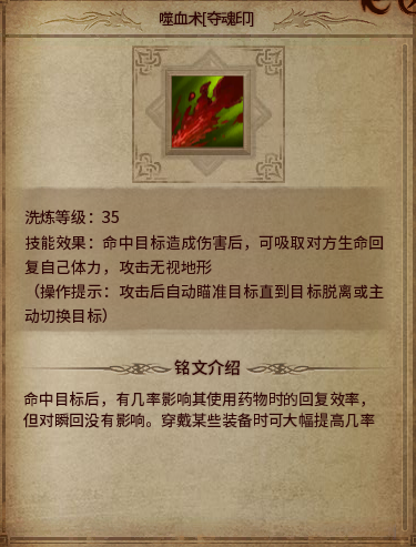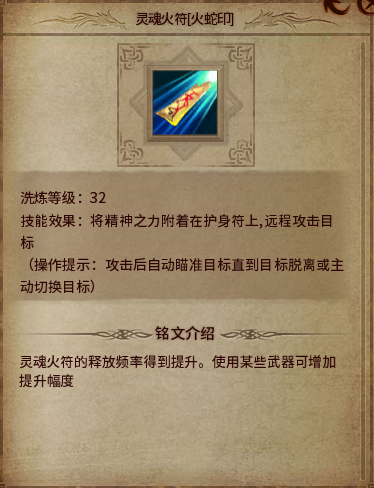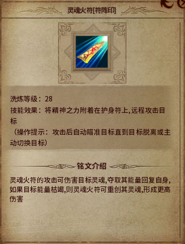 介绍:不错的铭文,简单的说就是灵魂火符伤害变高,而且带有吸血吸蓝效果。洗出这铭文出门2-3包蓝就足够了。练级非常好用!
