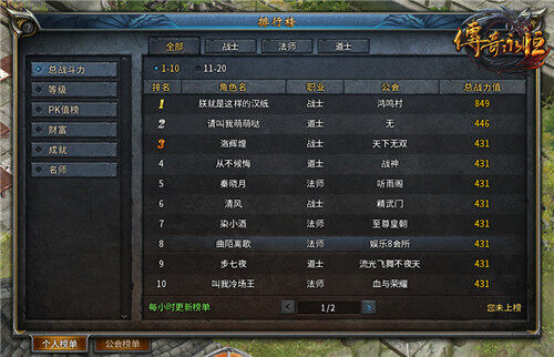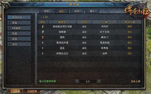 在《传奇永恒》中,排行榜主要分为个人和公会两个榜单。