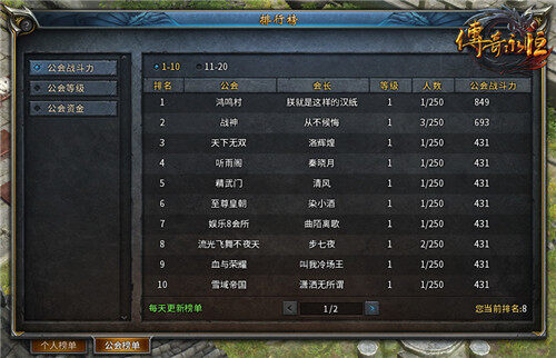 公会战斗力:根据当前服务器所有公会的综合实力高低进行排行。
