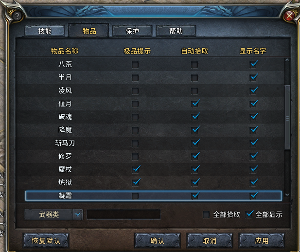对于想要拾取的物品,可以通过设定要拾取的物品类型来设置,也可以通过搜索来设置。如果你无从下手,也没关系,点击“恢复默认”,所有设定都将恢复成GM大神给你设定的样子,一样让你满意的!(如果不满意,请抽打GM大神!)