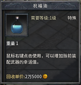 祝福油是一种神奇的道具,使用后可以给武器带来幸运,幸运越高的武器发挥最高攻击的几率越大。