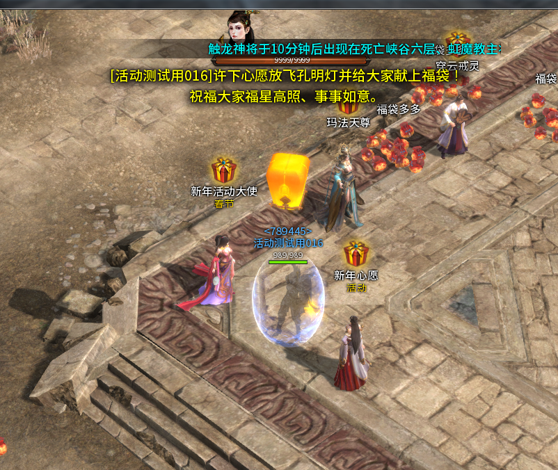 2、放飞孔明灯后,一盏满满心愿的孔明灯徐徐升空,同时将发出饱含玩家祝福的系统公告送给全服玩家。盟重城内也将出现“福袋多多”50个。每个“福袋多多”开启后将获得1000点经验,还有几率获得10000点经验。